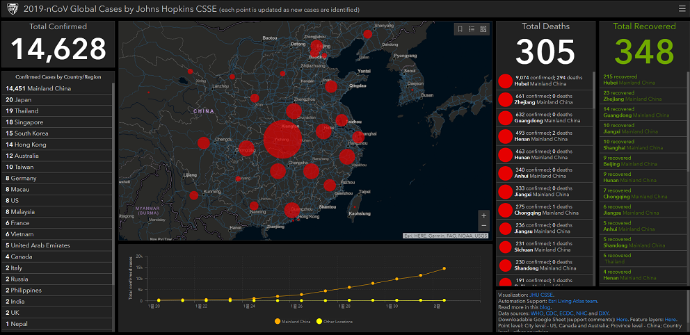 2020년 2월 2일 (한국시간) 기준으로 전세계 감염자수는 총 14,628명이며, 사망자수 305명, 완치자수 348명입니다.