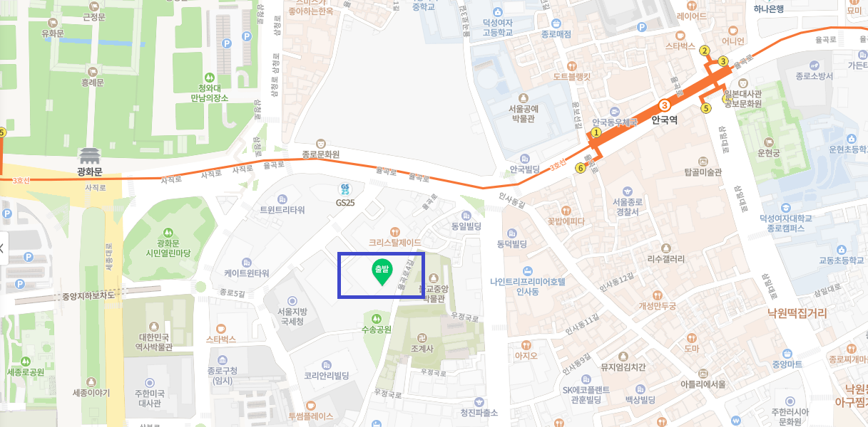 광화문 광장도 가깝고요.. 지하철역도 3호선 안국역과 5호선 광화문역, 1호선 종각역등이 가깝답니다. 모든역 10분 내에 도보로 갈 수 있지 않을까 싶습니다. 실제 거기까지 걸어서 가보지는 않았지만. 지도로 보면 가까워요.