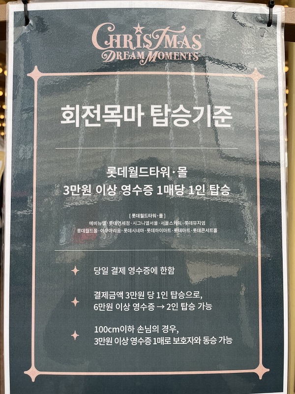 롯데월드타워와 몰에서 3만원 이상 구매한 영수증을 지참해서 가셔야 해요. 3만원 이상 구매한 영수증을 가져가시면 1매당 1명이 회전목마에 탑승할 수 있어요..