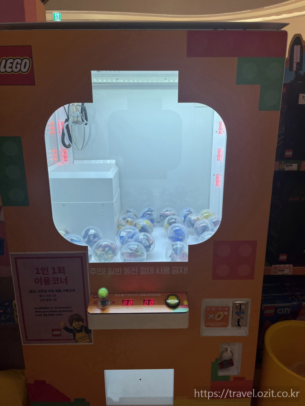 그러면 계산대 우측에 아래처럼 레고 뽑기 기계가 있답니다. 보통의 인형 뽑기 기계와 조작 방식은 동일해요.. 다만 인형이 아닌 레고가 담긴 뽑기가 있어요.